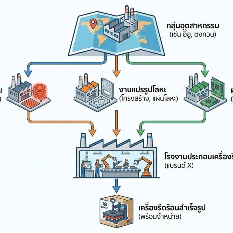 ในจีนการผลิตจำนวนมากอยู่ในรูปแบบ “คลัสเตอร์อุตสาหกรรม” โรงงานชิ้นส่วนอยู่ใกล้โรงงานประกอบ ซื้อของจากกันข้าง ๆ ต้นทุนเลยถูกและผลิตได้เร็ว แต่ผลข้างเคียงคือ **หลายแบรนด์ลงเอยใช้ชิ้นส่วนหลักๆ ใกล้เคียงกัน** โดยเฉพาะในกลุ่มเครื่องรีดร้อนระดับประหยัด/กลาง
