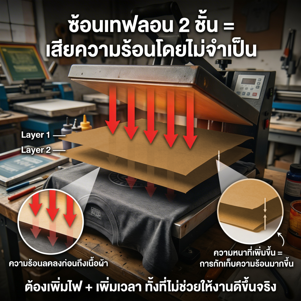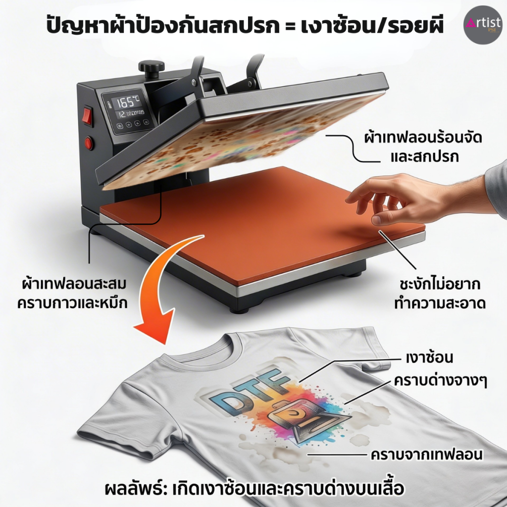 หลายร้านวางผ้าเทฟลอนไว้บนหน้าเพรสเพื่อกันกาว/กันเลอะทั้งวันแต่เครื่องมันร้อน งานก็รีบ ไม่มีใครคอยเช็คความสะอาดจริงจังผลคือ คราบกาว/หมึกจากงานก่อน อาจย้ายมาทับงานใหม่ → เกิด เงาซ้อน (ghost) หรือรอยด่างแบบหาสาเหตุไม่เจอ
