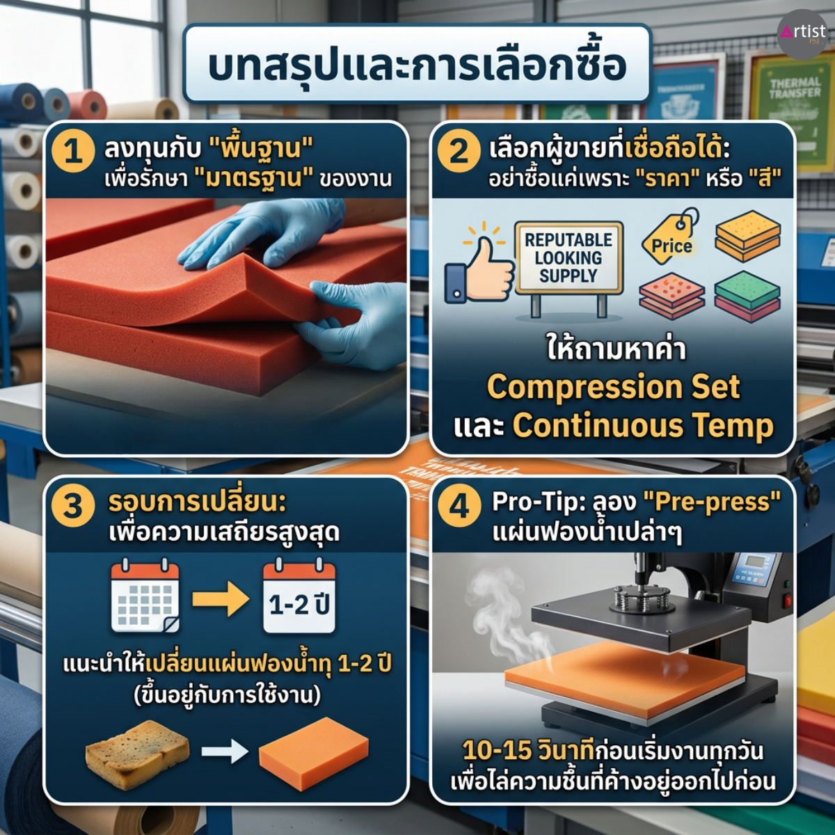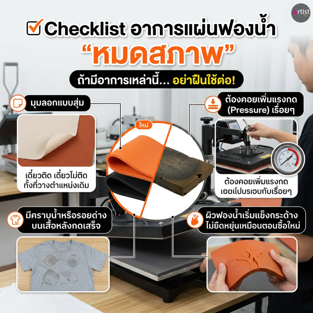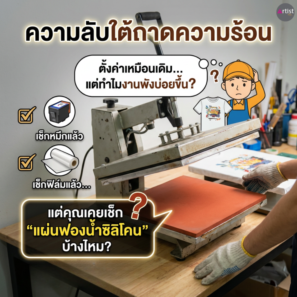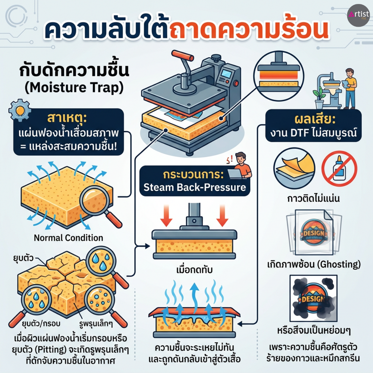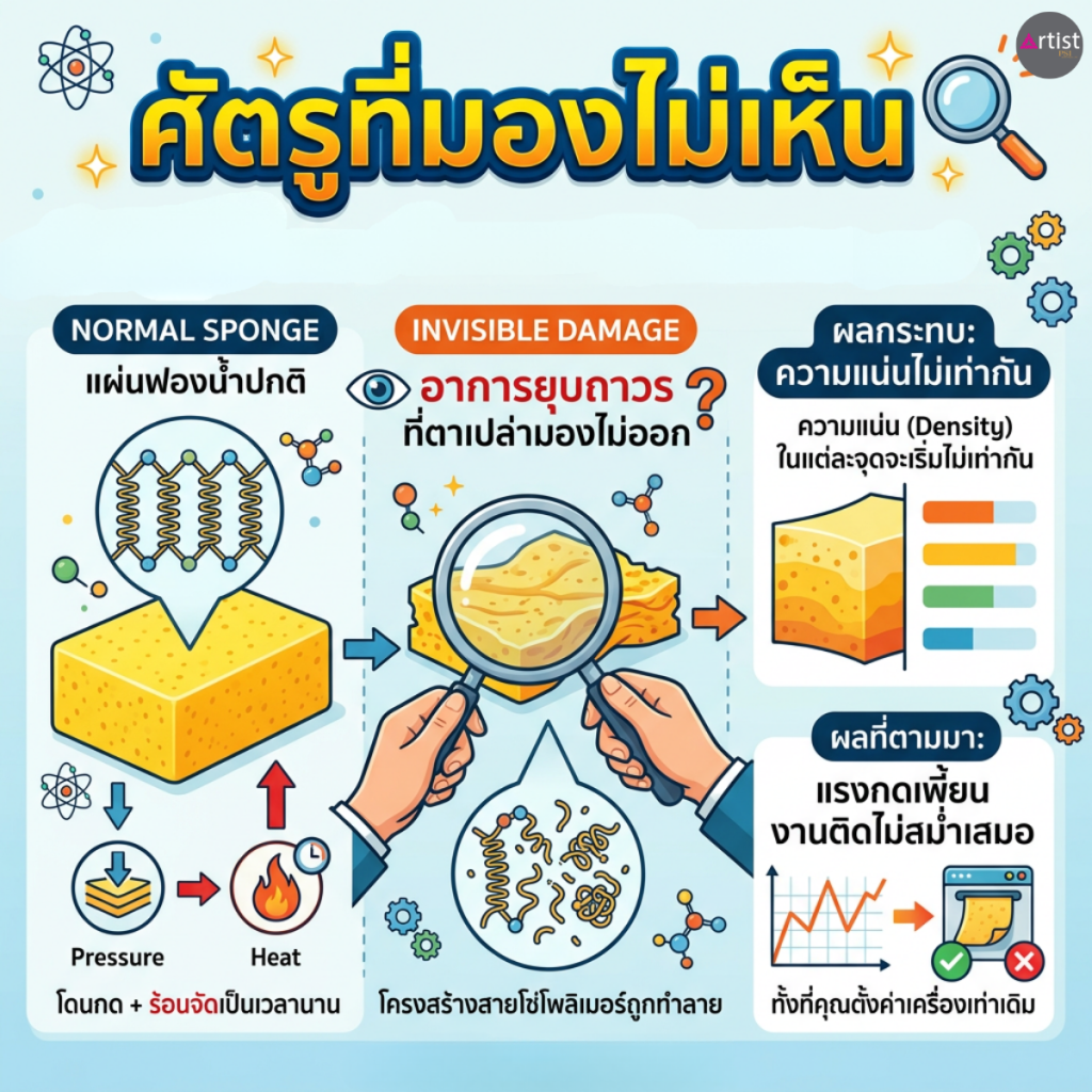 ความจริงคือ แผ่นฟองน้ำซิลิโคนมีอายุการใช้งาน! เมื่อผ่านการใช้งานหนัก โครงสร้างภายในจะเกิดการ “ยุบถาวร” (Compression Set) และกลายเป็น “กับดักความชื้น” ที่ทำให้งานสกรีนของคุณไม่เสถียร